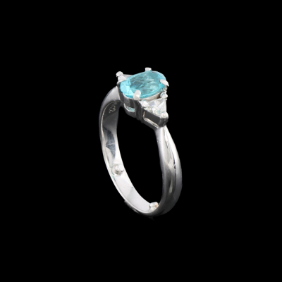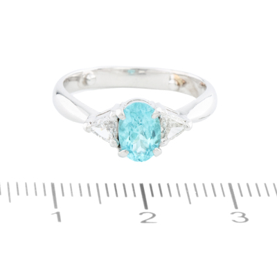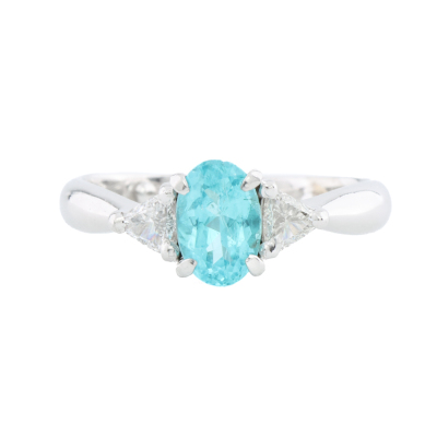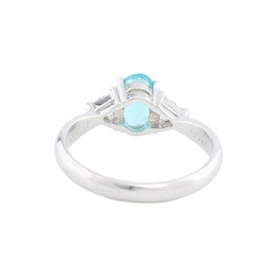 Tourmaline and Diamond ring with oval shape Brazilian Natural Paraiba Tourmaline of 0.81ct (with GIA Origin Report #5513236704) and 2 trilliant cut Natural Diamonds totalling 0.22ct. Platinum - 900. Ring size: K1/2 with 2 stabilizing beads inside the band. Band width: 2.6mm - 2.3mm. Weight: 4.4g. (Pre-owned)