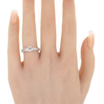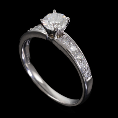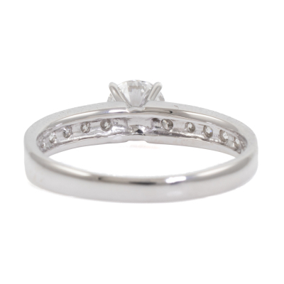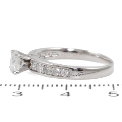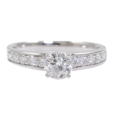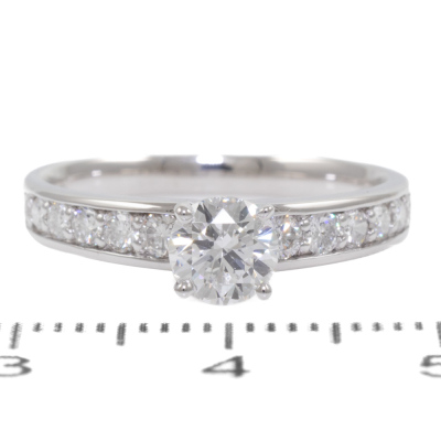 Diamond ring with centre round diamond of 0.57ct (with GSL Memo graded as F SI1 #GSL010822-2) and surrounding natural round Diamonds totalling 0.34ct (Estimated grading G-H SI). Platinum-900 band and 18ct white gold claw setting. Ring size: L1/4. Band width: 2.2mm - 2.9mm. Weight: 3.9g. (New)