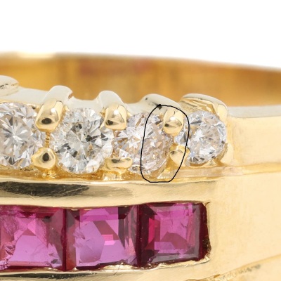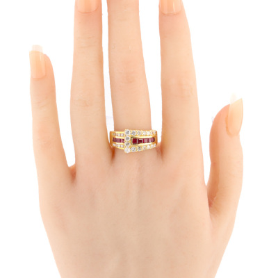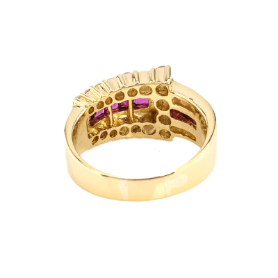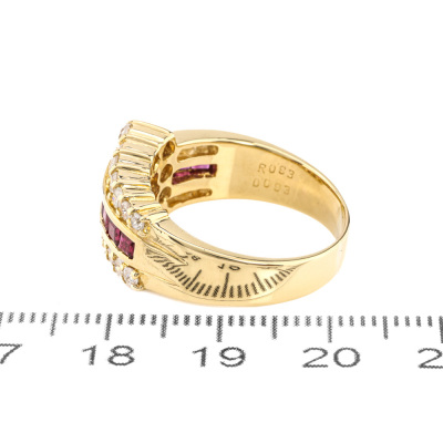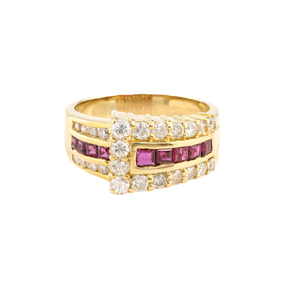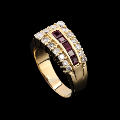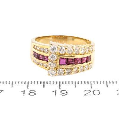 Ruby and Diamond ring with square cut Natural Ruby totalling 0.93ct and round Natural Diamonds totalling 0.93ct. (Estimated grading: I-J SI-P1). 18ct yellow gold. Ring size: Q. Ring band: 4.0mm - 5.8mm. Weight: 9.2g. (Pre-owned)