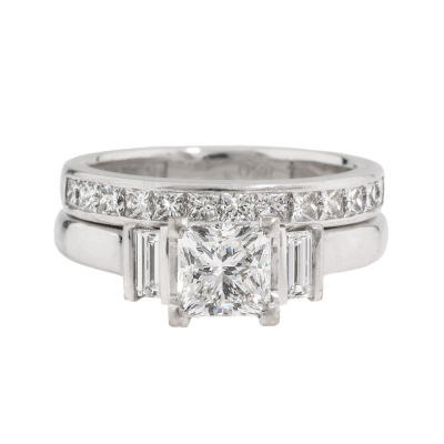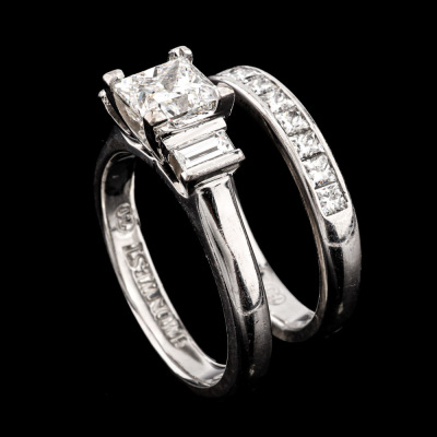 Simon West Diamond Ring set. 1) Trilogy ring with a centre princess cut Natural Diamond of approximately 0.97ct (Estimated grading: F VS2) and side baguette cut Natural Diamonds totalling approximately 0.19ct. Ring size J1/4. 2) Eternity ring with 13 princess cut Natural Diamonds totalling approximately 0.78ct (Estimated grading: G-H SI). Ring size J. Both band width: 2.8mm. Both 18ct white gold. Total weight: 8.4g. (Pre-owned)