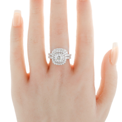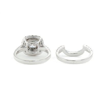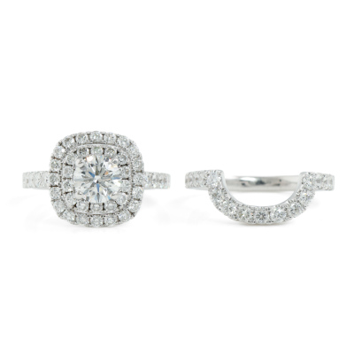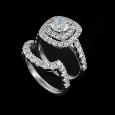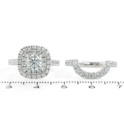 Bridal ring set. 1) Diamond double halo ring with a centre round brilliant cut Natural Diamond of 0.97ct (with GIA Report graded as E SI1 #5181547687) and supporting round Natural Diamonds totalling 1.08ct (Estimated grading: G-H VS-SI). Ring size M. Band width: 2.2mm. 2) Fitted wedder with round Natural Diamonds totalling 0.62ct (Estimated grading: G-H VS-SI). 18ct white gold. Ring size N. Band width: 2.2mm-2.3mm. Both 18ct white gold. Combined weight: 9.3g. (Pre-owned)