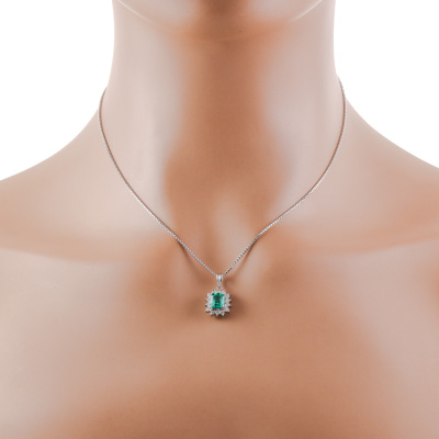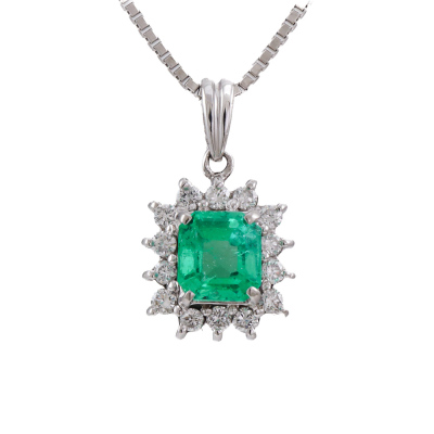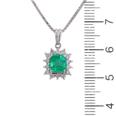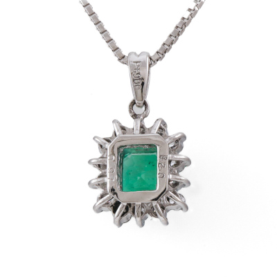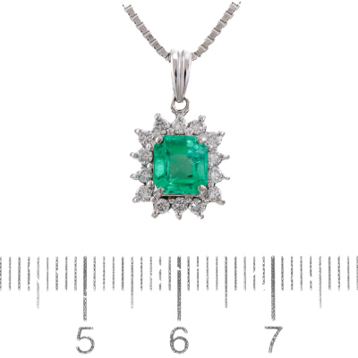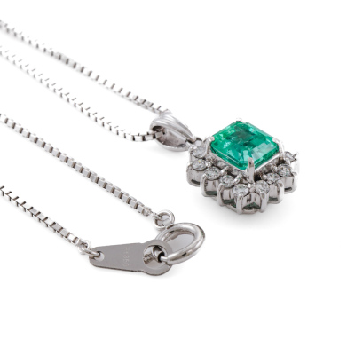 Emerald and Diamond pendant with an emerald cut Natural Emerald of 0.97ct and round Natural Diamonds totalling 0.28ct. Platinum 900 with 36cm-40cm Platinum 850 adjustable chain. Weight: 7.0g.