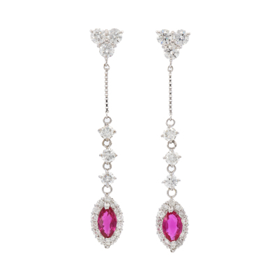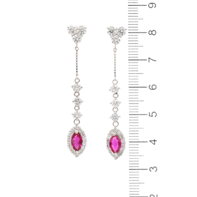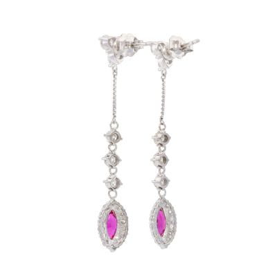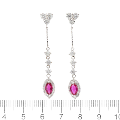 Ruby and Diamond dangle earrings with marquise cut Natural Rubies totalling 0.98ct and round Natural Diamonds totalling 2.48ct (Estimated grading: GHI SI-P1. 18ct white gold. Weight: 4.5g.