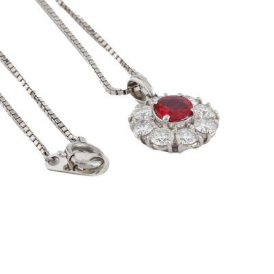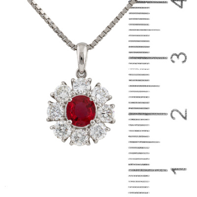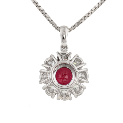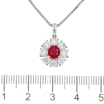 Ruby and Diamond pendant with an oval shape Natural Ruby of 0.55ct (with GIA Ruby Origin Report stating origin: Thailand #1538120980) and round Natural Diamonds totalling 0.99ct (Estimated grading: G-H VS). Platinum - 900 with Platinum - 850 adjustable chain. Length: 36cm-40cm Weight: 6.0g. (Pre-owned)
