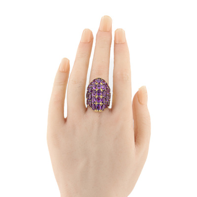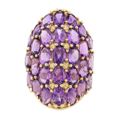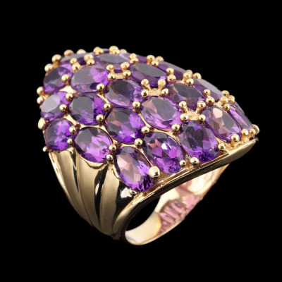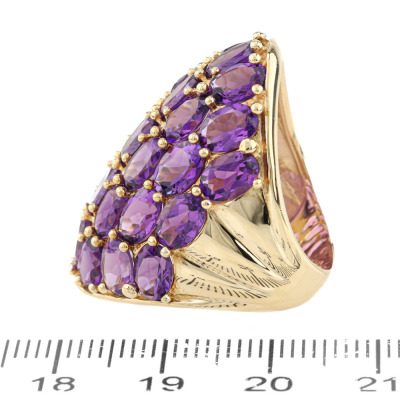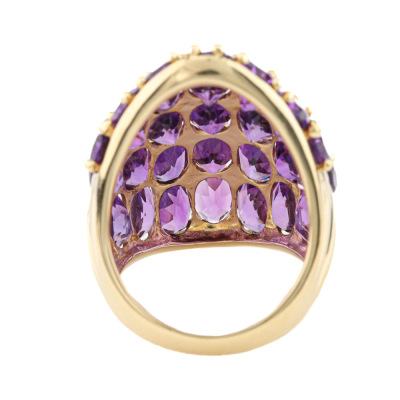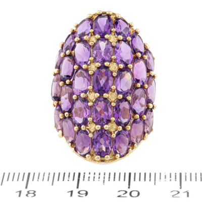 Amethyst ring with 29 oval shape Natural Amethyst totalling approximately 10.00ct. 18ct yellow gold. Ring size K1/4. Band width: 3.5mm - 5.5mm. Weight: 11.0g. (Pre-owned)
