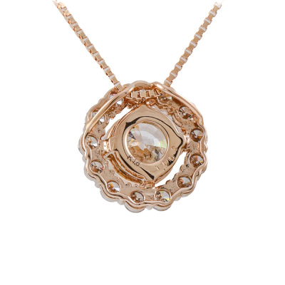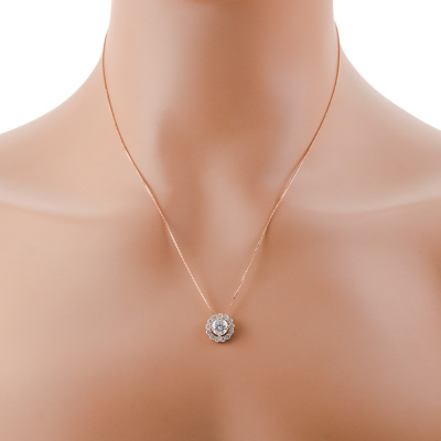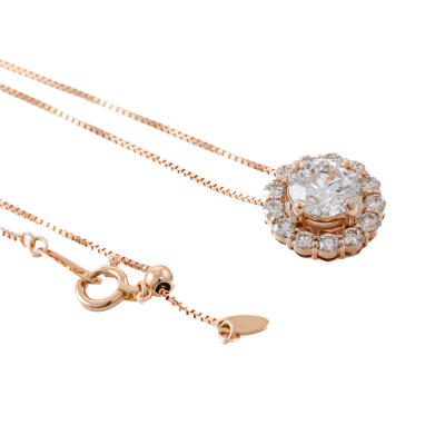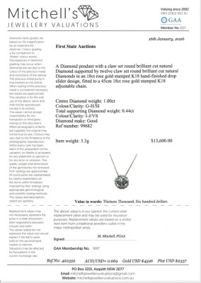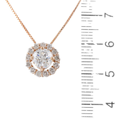 Diamond halo pendant with centre round brilliant cut Natural Diamond of 1.00ct (Estimated grading: G-H SI) and remaining round Natural Diamonds totalling approximately 0.44ct (Estimated grading: I-J VS). 18ct rose gold and 45cm 18ct rose gold adjustable chain. Weight: 3.3g. With Valuation Certificate #422359.