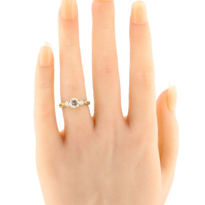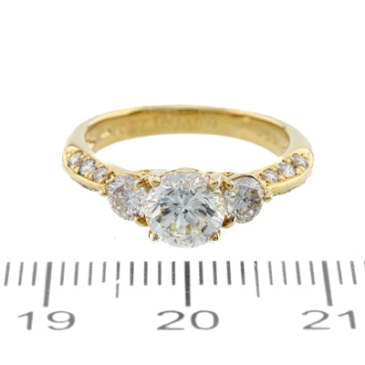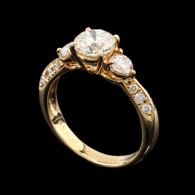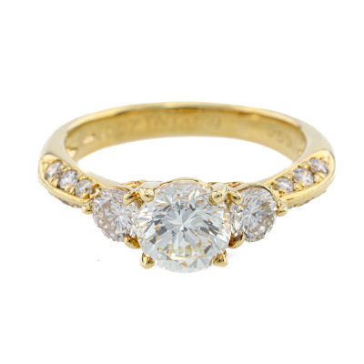 Diamond ring with centre round Natural Diamond of 1.00ct (Estimated grading: J P1) and surrounding round Natural Diamonds totalling 0.50ct (Estimated grading: H-I SI-P1). 18ct yellow gold. Ring size J. Band width: 2.5mm - 3.2mm. Weight: 3.5g. (Pre-owned)
