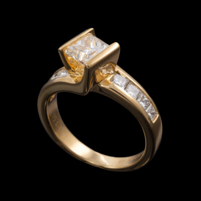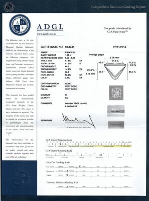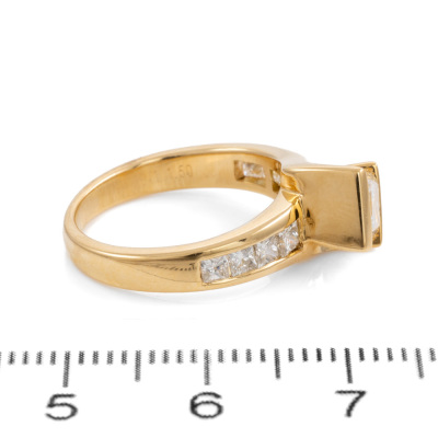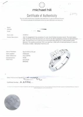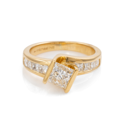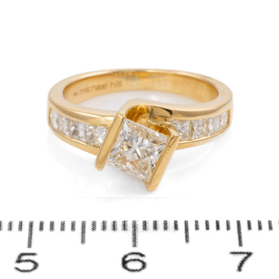Michael Hill Diamond ring with a centre princess cut Natural Diamond of 1.00ct (with ADGL Certificate graded as H SI2 #H54941) & remaining princess cut Natural Diamonds totalling 0.50ct (Estimated grading: I SI2). 18ct yellow gold. Ring size J1/2. Band width: 3.6mm - 2.4mm. Weight: 5.9g. With Michael Hill Certificate of Authenticity with retail price dated 24/09/2015. (Pre-Owned)