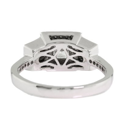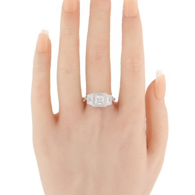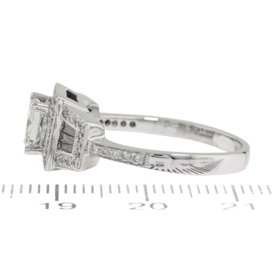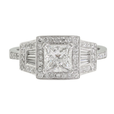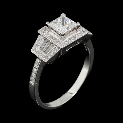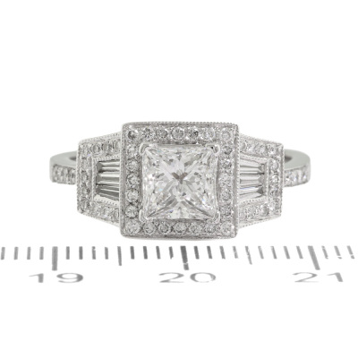 Diamond ring with centre princess cut Natural Diamond of approximately 1.00ct (Estimated grading G VS) and round & baguette cut Natural Diamonds totalling approximately 0.60ct (Estimated grading: G VS). 18ct white gold. Ring size: Q1/2. Band width: 2.3mm. Weight: 6.3g. (Pre-owned)
