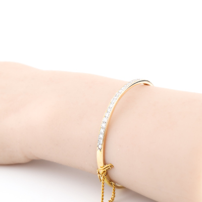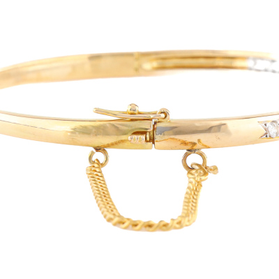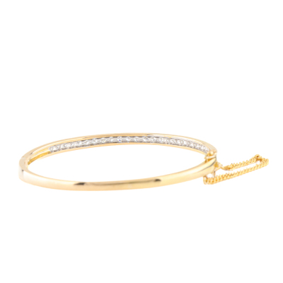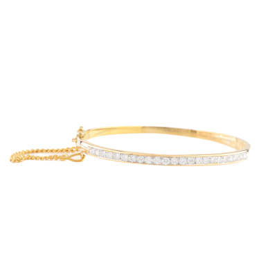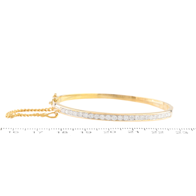 Diamond hinged bangle with 23 round Natural channel set Diamonds totalling 1.00ct (Estimated grading: G-H SI). 18ct yellow gold with safety chain. Inner circumference: 15.5cm. Width: 3.5mm. Weight: 12.5g. (Pre-owned)