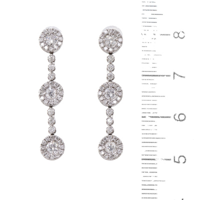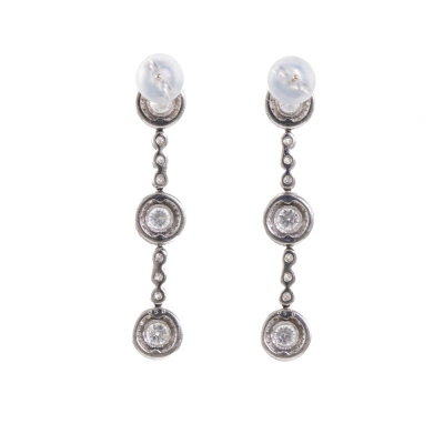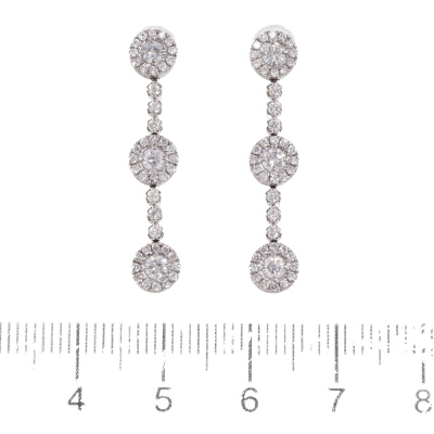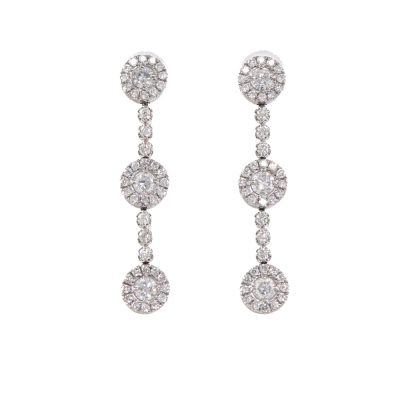 Diamond dangle earrings with round Natural Diamonds totalling 1.00ct (Estimated grading: H-I P1). 18ct white gold with platinum 900 and silicon backs. Drop length: 3.0cm. Weight: 3.4g.