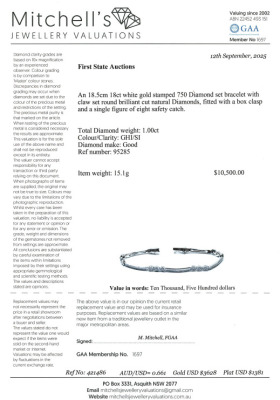 Diamond dress bracelet with round Natural Diamonds totalling 1.00ct (Estimated grading: GHI SI). 18ct white gold. Length: 18.5cm. Weight: 15.1g. With Valuation Certificate #421486. (Pre-owned)