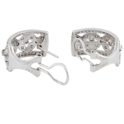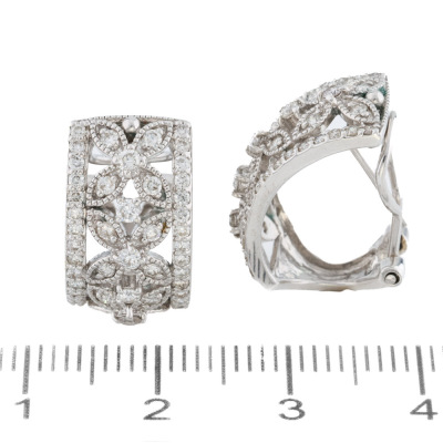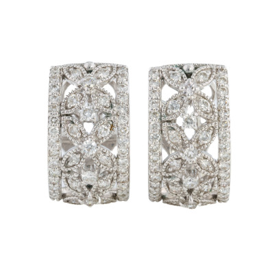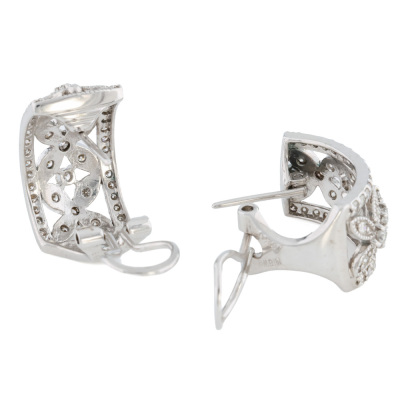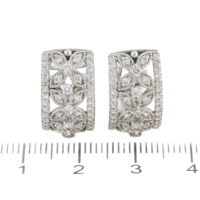 Filigree style Diamond clip-on earrings (with foldable posts for both pierced & non-pierced ears) with round Natural Diamonds totalling approximately 1.00ct (Estimated grading: HIJ SI). 18ct white gold. Dimensions: 1.6cm x 0.9cm. Weight: 6.7g. (Pre-owned)