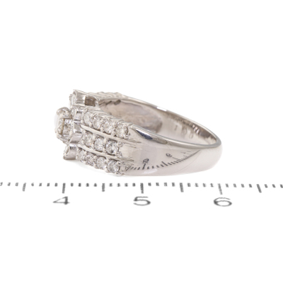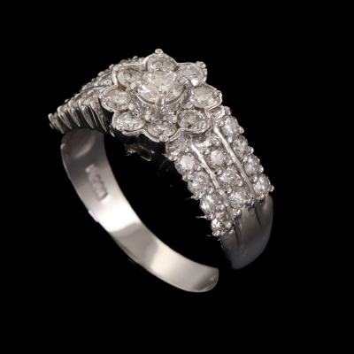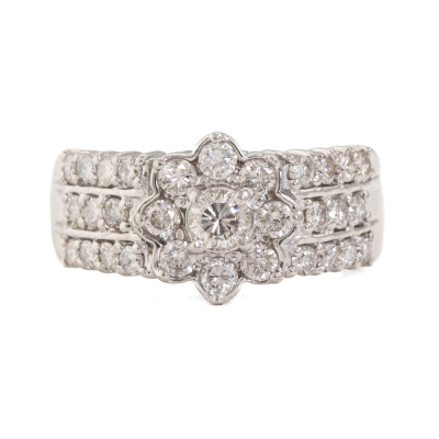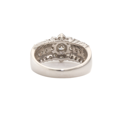 Diamond dress ring with round Natural Diamonds totalling 1.00ct (Estimated grading: J SI). Platinum - 900. Ring size L½. Band width: 3.2mm - 5.4mm. Weight: 8.1g. (Pre-owned)