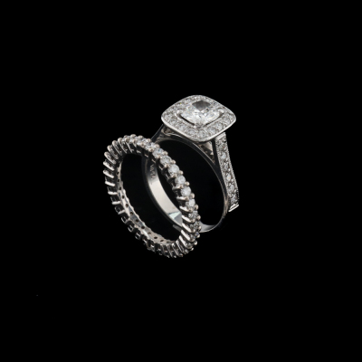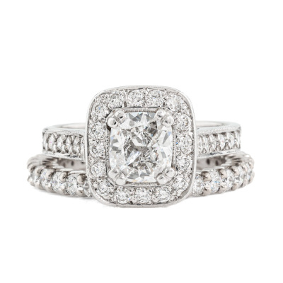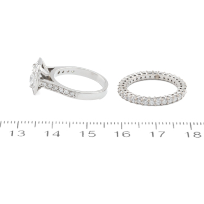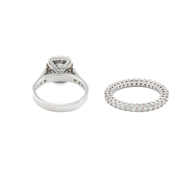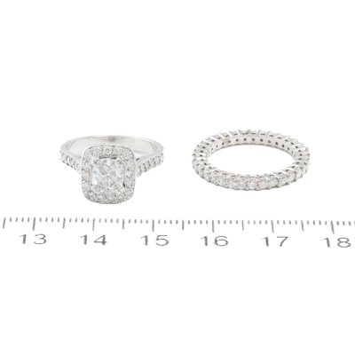 Engagement ring set. 1) Diamond halo ring with a centre cushion cut Natural Diamond of approximately 1.00ct (Estimated grading: G-H SI) and remaining round Natural Diamonds totalling approximately 0.28ct. Ring size: J. Band width: 2.6mm. 2) Diamond full eternity with round Natural Diamonds totalling approximately 0.70ct (Estimated grading: G-H SI). 18ct white gold. Ring size: I 3/4, ring resizing is not recommended. Band width: 2.2mm. Combined weight: 7.4g. (Pre-owned)
