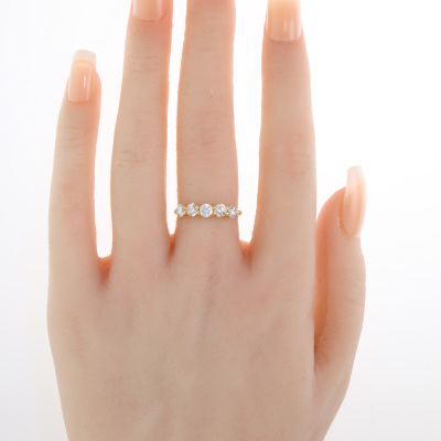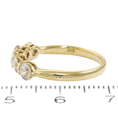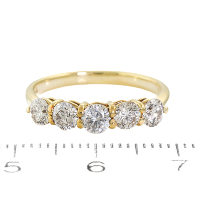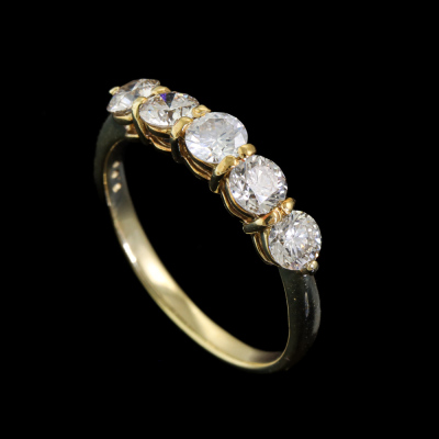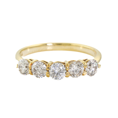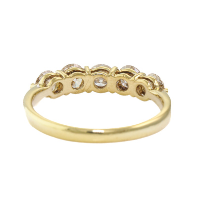 Diamond eternity ring with 5 round Natural Diamonds totalling 1.00ct (Estimated grading: I-J & M-N SI). 18ct yellow gold. Ring size L1/2. Band width: 2mm-2.2mm. Weight: 2.5g. (Pre-owned)