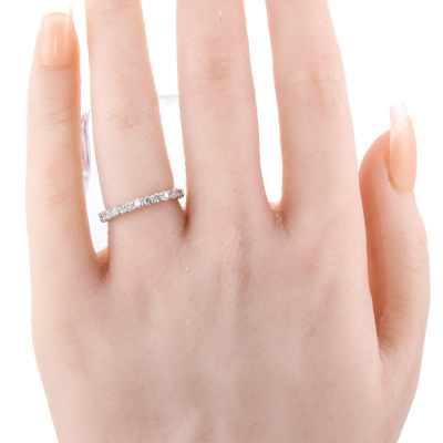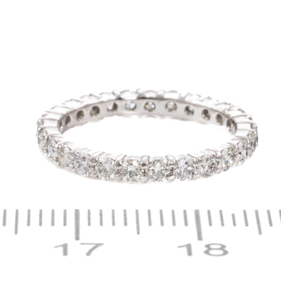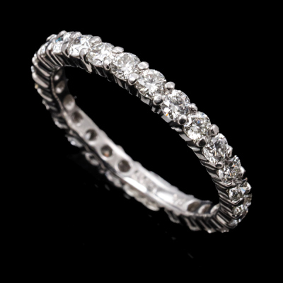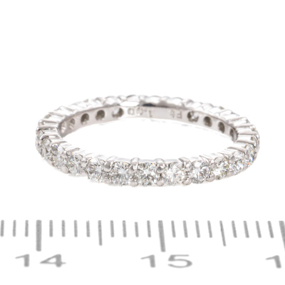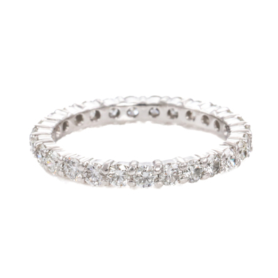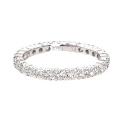Diamond full hoop eternity ring with round Natural Diamonds totalling 1.00ct (Estimated grading: G-H VS). Platinum 900 (XRF tested, stamp 'Pt'). Ring size I3/4 - ring resizing is not recommended. Band width: 2.4mm. Weight: 2.5g. (Pre-owned)