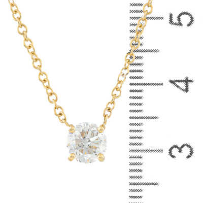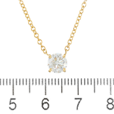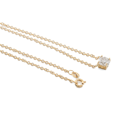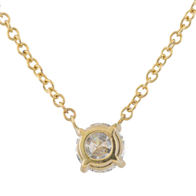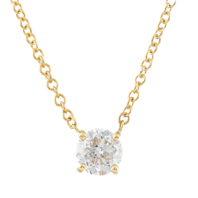 Diamond solitaire pendant with a round brilliant cut Natural Diamond of 1.00ct (with GIA Report graded as E P1 #6525287014). 18ct yellow gold with 18ct yellow gold attached chain. Length: 45.5cm. Weight: 3.1g (New)