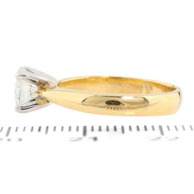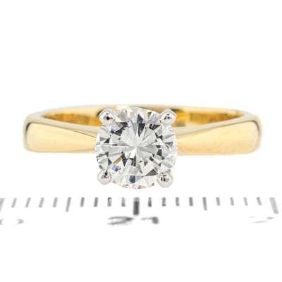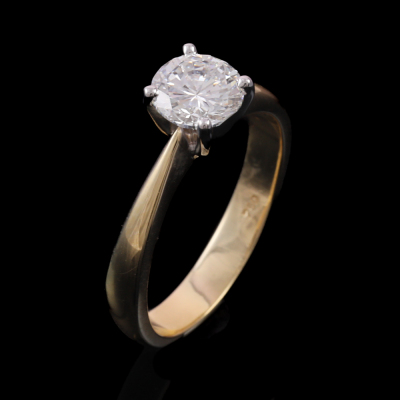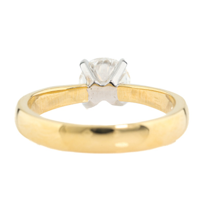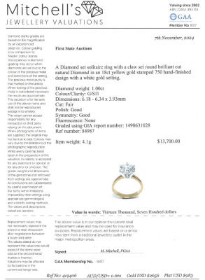 Diamond solitaire ring with round natural brilliant cut Diamond of 1.00ct (With GIA Report graded as G SI1 # 1498631028). 18ct white and yellow gold. Ring size L. Band width: 3.2mm - 2.1mm. Weight 4.1g. With Valuation Certificate #419406. (New)