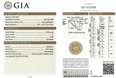 Diamond stud earring with round brilliant cut Natural Diamonds totalling 1.00ct (with GIA Dossier Reports graded as D VS2 #6511531958, 2527806871). 18ct white gold. Weight: 1.3g. (New)