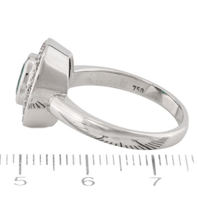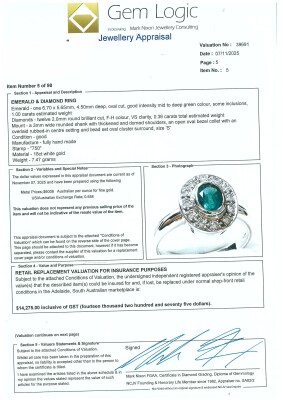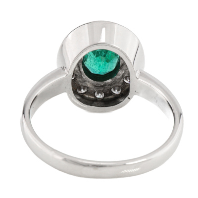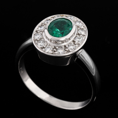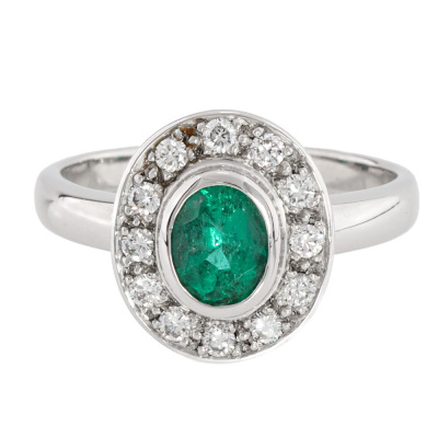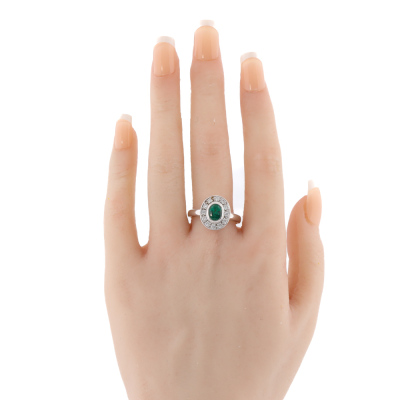 Emerald and Diamond ring with centre oval shape Natural Emerald of 1.00ct and 12 round Natural Diamonds totalling 0.36ct (Estimated grading: F-H VS). 18ct white gold. Ring size S. Band width: 2.7mm - 3.2mm. Weight: 7.5g. With Valuation Certificate dated 07/11/2025. (Pre-owned)
