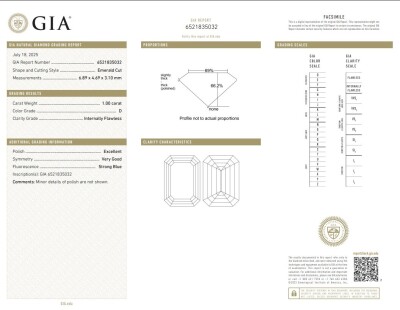 A loose emerald cut Natural Diamond of 1.00ct (With GIA report graded as D Internally Flawless #6521835032 ). (New)