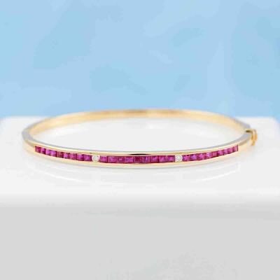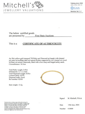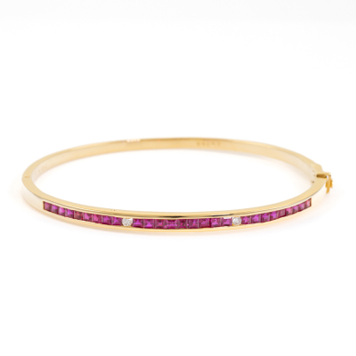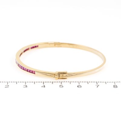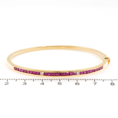Ruby and Diamond oval bangle with carre cut natural Rubies totalling 1.00ct and round natural Diamonds totalling 0.04ct. Circumference: 16.5cm. 18ct yellow gold. Width: 2.5mm. Weight:13.5g. With Certificate #418800. (Pre-owned)