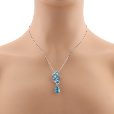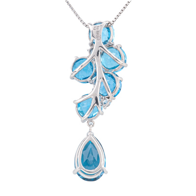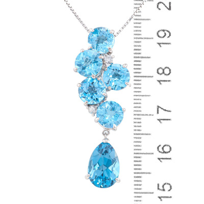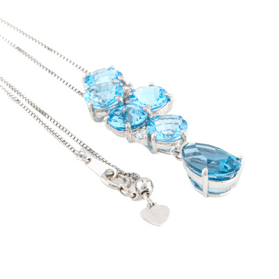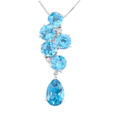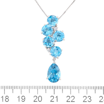 Topaz pendant with 5 round checkerboard cut and 1 pear shape blue Natural Topaz totalling approximately 10.00ct and 2 round white Natural Topaz totalling approximately 0.10ct. 14ct white gold with 45cm 14ct white gold adjustable chain. Weight: 7.6g. (Pre-owned)