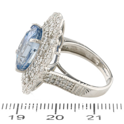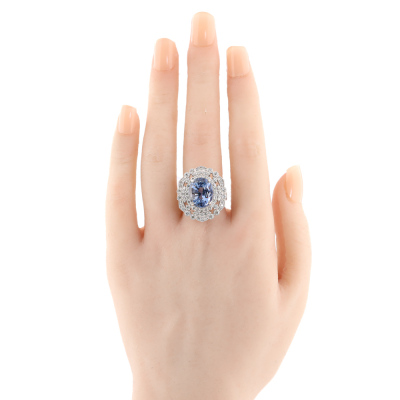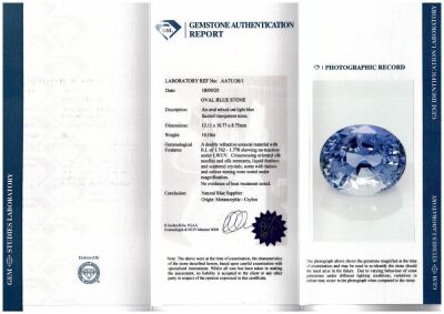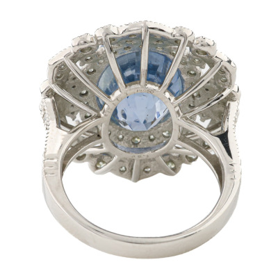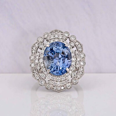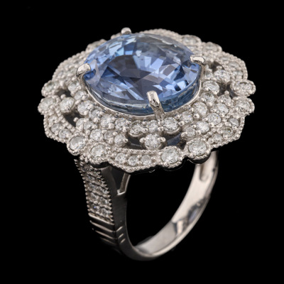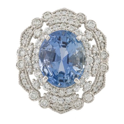 Sapphire and Diamond ring with centre oval shape unheated Ceylon Natural Blue Sapphire of 10.10ct (With GSL Report #AA71136/1) and round Natural Diamonds totalling 1.39ct (Estimated grading: G-H VS-SI). Platinum - 950. Ring size L1/4. Band width: 2.7mm - 3.6mm. Weight: 13.7g. (Pre-owned)