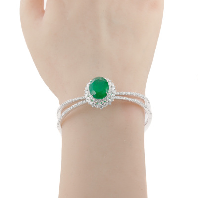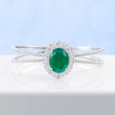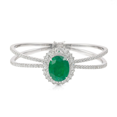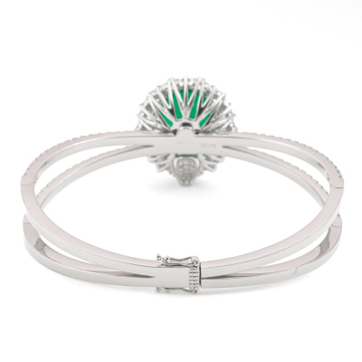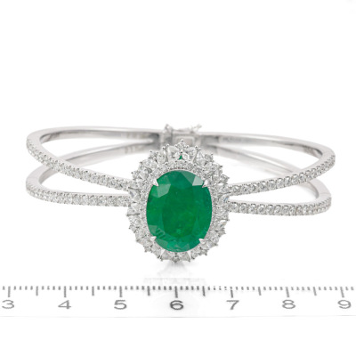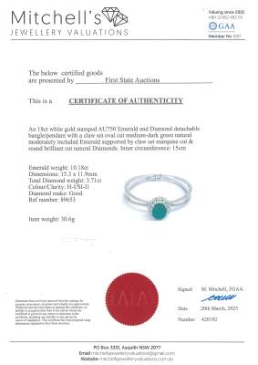 Emerald and Diamond detachable bangle (Note: Emerald pendant is detachable from the bangle) with an centre oval shape Natural Emerald of 10.18ct and round, pear & marquise cut Natural Diamonds totalling 3.71ct (Estimated grading: H-I SI-P1). 18ct white gold. Inner circumference: approximately 15cm. Weight: 30.6g. With Certificate #420192. (Pre-owned)