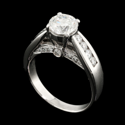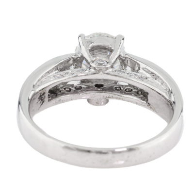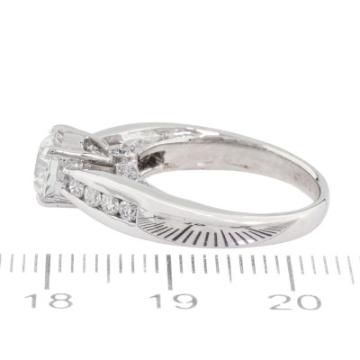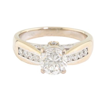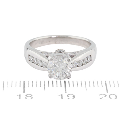 Diamond engagement ring with centre round brilliant cut Natural Diamond of 1.01ct (with Copy of IGI Report graded as F VS1) and round Natural Diamonds totalling approximately 0.28ct. 18ct white gold. Ring size I1/2. Band width: 2.5mm - 4.5mm. Weight: 5.3g.