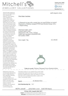Diamond ring with round brilliant cut Natural Diamond of 1.01ct (with GIA Report graded as G SI2 #6492033496). Platinum - 950. Ring size K3/4. Band width 3.2mm - 2.2mm. Weight: 7.8g. With Valuation Certificate #419048. (New)