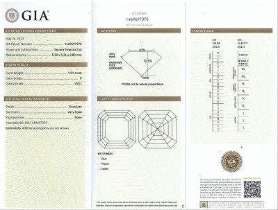 A loose square Emerald cut Natural Diamond of 1.01ct (with GIA report graded as F VVS1 #1469697370). (New)