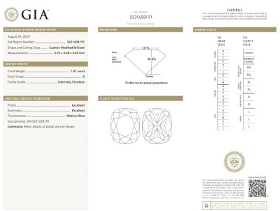 A loose cushion cut Natural Diamond of 1.01ct (with GIA report graded as D Internally Flawless #5231658191 ). (New)