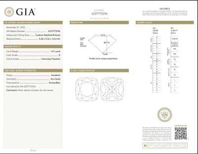 A loose cushion cut Natural Diamond of 1.01ct (with GIA report graded as D Internally Flawless #6237773296 ). (New)