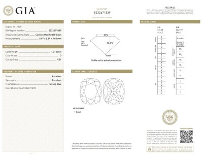 A loose cushion cut Natural Diamond of 1.01ct (with GIA report graded as D VS1#5232671839 ).