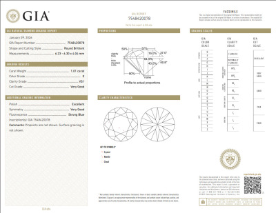 A loose round brilliant cut Natural Diamond of 1.01ct (with GIA Diamond Report graded as E VS1 #7548420078)
