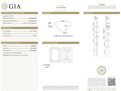 A loose emerald cut Natural Diamond of 1.01ct (With GIA Report graded as E VVS2 #6237689484). (New)