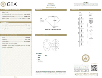 A loose oval shape Natural Diamond of 1.01ct (with GIA Report graded as E VVS1 #6525734860). (New)