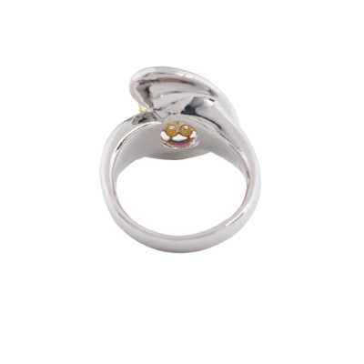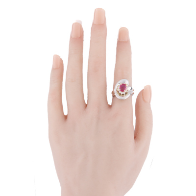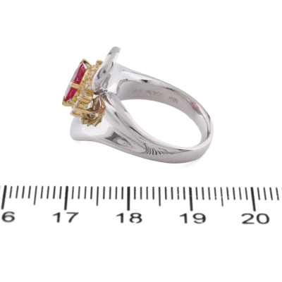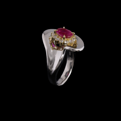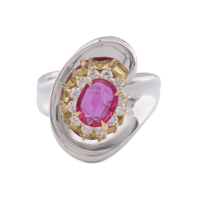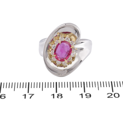 Ruby and Diamond ring with centre oval shape Natural Ruby of 1.01ct and 12 round Natural Diamonds totalling 0.37ct (Estimated grading: H-I VS). Platinum 900 & 18ct yellow gold. Ring size: L. Band width: 3.2mm - 4.3mm. Weight: 15.4g. (As New)