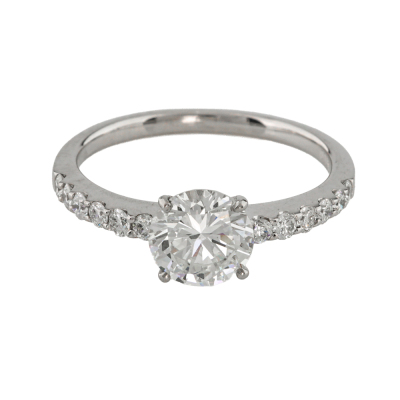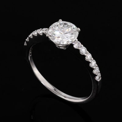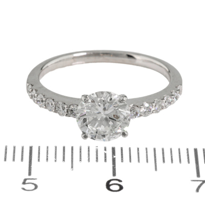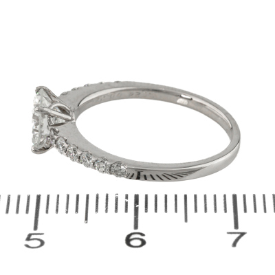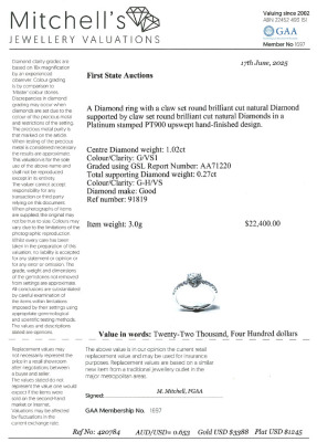 Diamond solitaire ring with centre round brilliant cut Natural Diamond totalling 1.02ct (With GSL Report graded as: G VS1 #AA71220) and remaining round Natural Diamonds totalling 0.27ct (Estimated Grading: G-H VS). Platinum - 900. Ring size L. Band width: 1.6mm. Weight: 3g. With Valuation Certificate #420784.