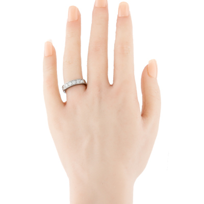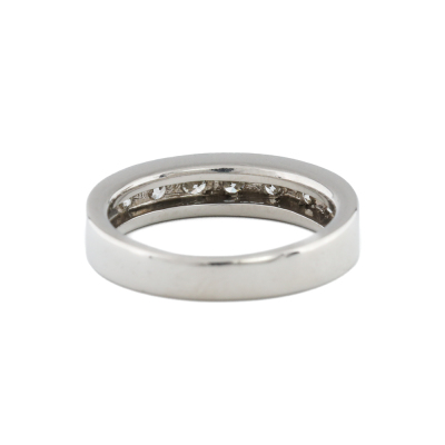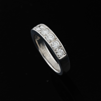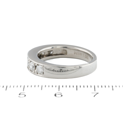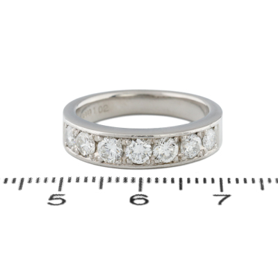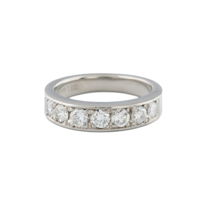Diamond eternity ring with 7 round Natural Diamonds totalling 1.02ct (Estimated grading: G-H VS-SI). Platinum - 900. Ring size L. Band width: 3.2mm - 4.2mm. Weight: 8.0g. (Pre-owned)