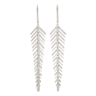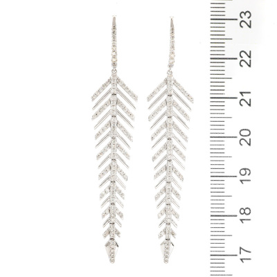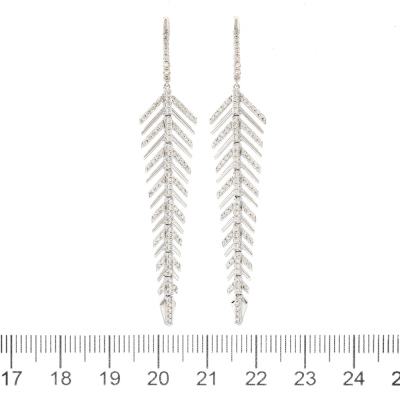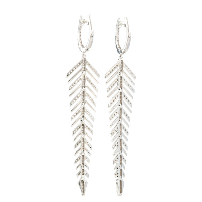 Leaf design earrings with round Natural Diamonds totalling 1.02ct (Estimated grading: HIJ SI). 14ct white gold. Drop length: 6.2cm. Weight: 6.8g(New).