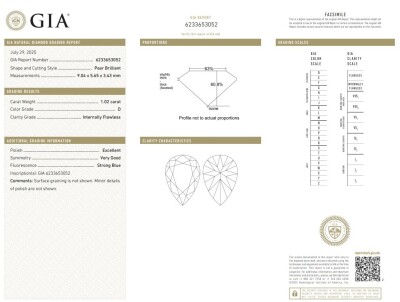 A loose pear shape natural Diamond of 1.02ct (with GIA report graded as D Internally Flawless #6233653052). (New)