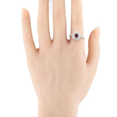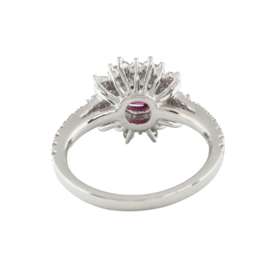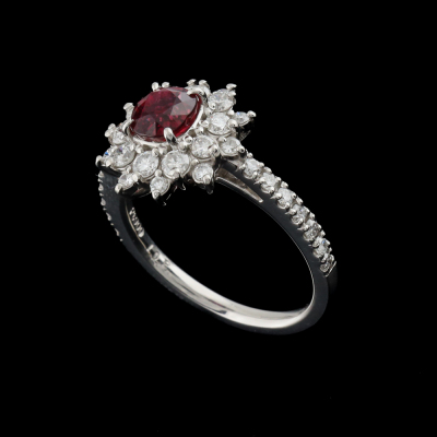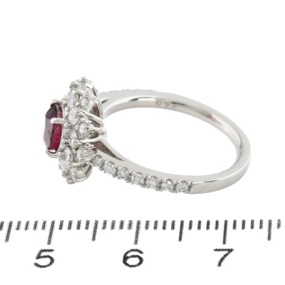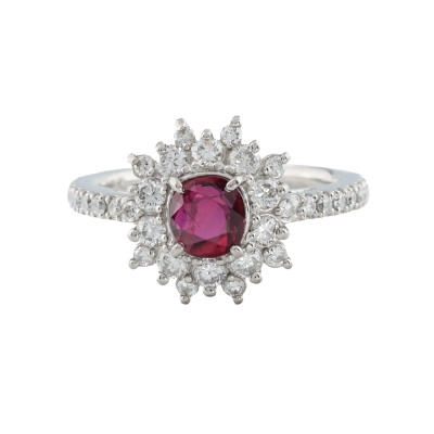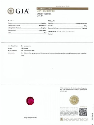 Ruby and Diamond ring with centre cushion cut Natural Thai Ruby of 1.02ct (with GIA Ruby Origin Report #1483984204) and round Natural Diamonds totalling 0.75ct (Estimated grading: G VS-SI). Platinum - 900. Ring size L1/4. Band width: 1.7mm - 1.8mm. Weight: 6.5g. (Pre-owned)