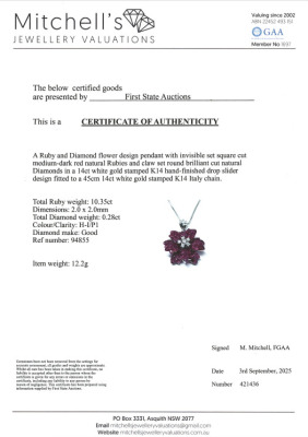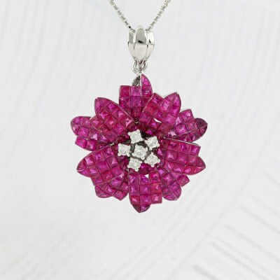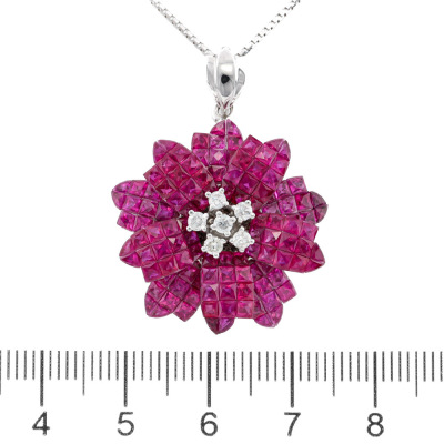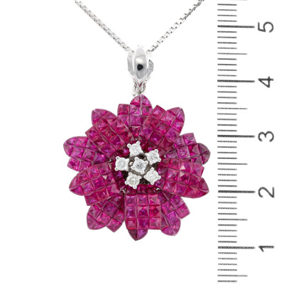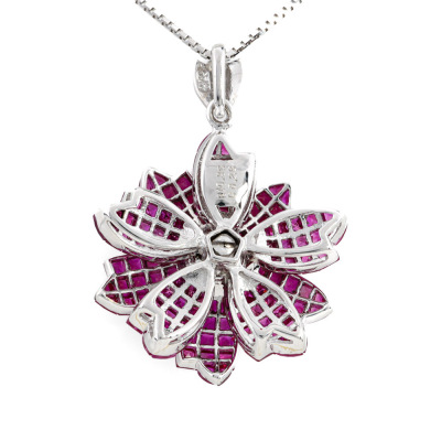 Floral design pendant with princess and fan cut Natural Rubies totalling 10.35ct and round Natural Diamonds totalling 0.28ct. 14ct white gold with 45cm 14ct white gold adjustable chain, Made in Italy. Weight: 12.2g. With Certificate #421436. (Pre-owned)