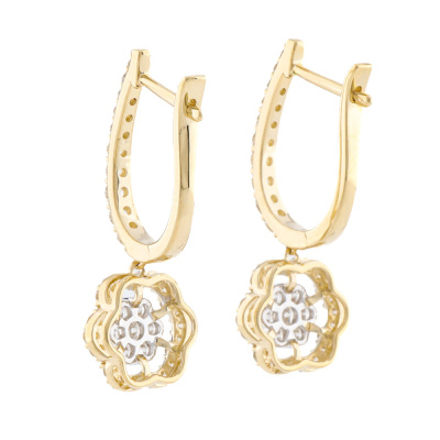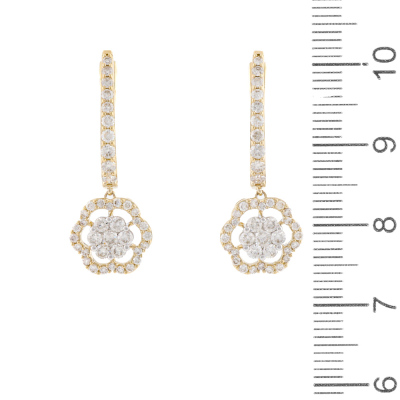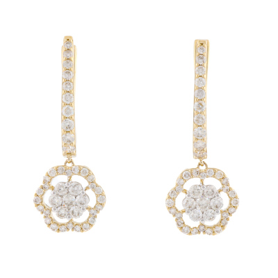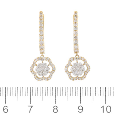 Diamond dress earrings with round natural Diamonds totalling 1.03ct (Estimated grading: H SI). 14ct yellow gold with white rhodium plated claw setting. Length: 2.8cm