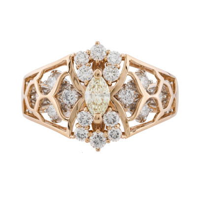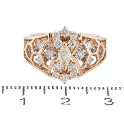 Diamond dress ring with a centre marquise cut Natural Yellow Diamond of 0.75ct (Estimated grading: Natural Light Yellow VS) and remaining round Natural Diamonds totalling 0.28ct. 18ct yellow gold. Ring size M3/4. Band width: 3.7mm - 5.2mm. Weight: 5.1g.