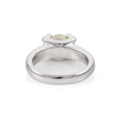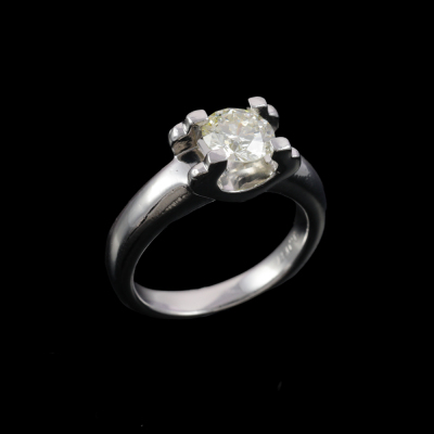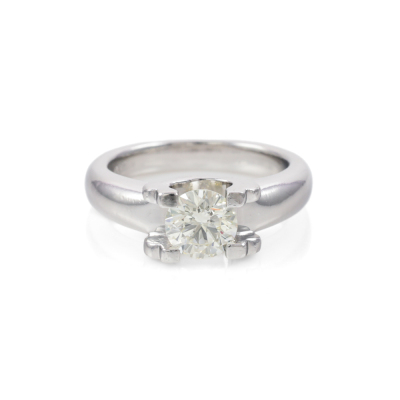 Diamond solitaire ring with a round Natural Diamonds of 1.03ct (Estimated grading: K-L SI1). Platinum - 900. Ring size J3/4. Band width: 3mm - 4.2mm. Weight: 11.6g. (Pre-owned)