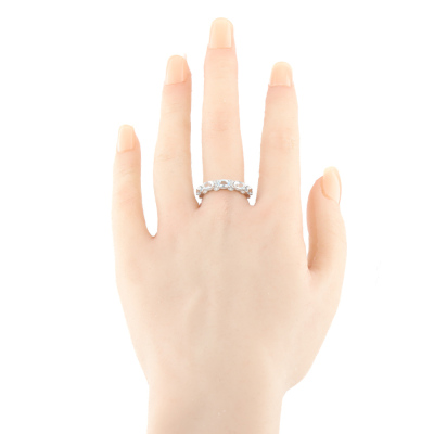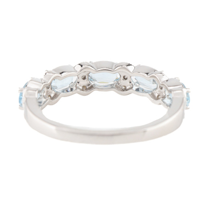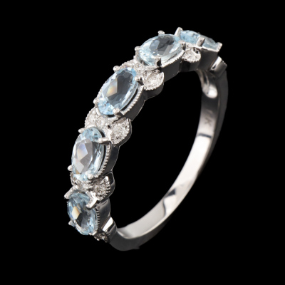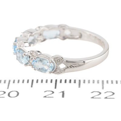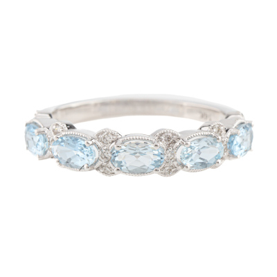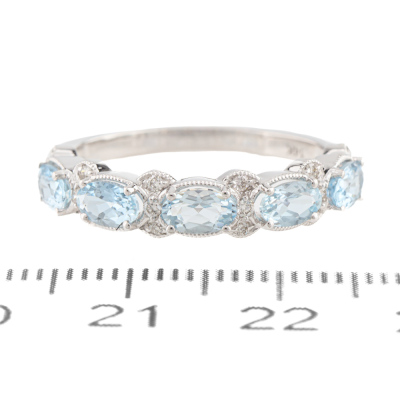 Aquamarine and Diamond ring with 5 oval natural Aquamarines totalling 1.04ct and round Diamonds totalling 0.12ct. 14ct white gold. Ring size: N. Band width: 1.8mm - 3.0mm. Weight: 2.7g. (New)